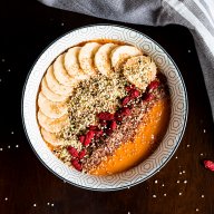 Und was meint ihr? Ich finde die Farbe dieser Smoothie Bowl wirklich schön. Wie oft isst man schon mal eine orangene Smoothie Bowl? Durch das Proteinpulver habt ihr auch direkt die perfekte Grundlage für den Tag. Vor allem wenn ihr noch Sport machen wollt, dann ist diese High Protein Variante optimal. Optional könnt ihr das Proteinpulver natürlich auch weglassen, dann wird die Smoothie Bowl allerdings etwas weniger cremig. Es sei denn, ihr verwendet statt frischen Früchten gefrorene. Wobei mir persönlich das morgens immer zu kalt ist. Ich mag es lieber kühlschrank-kalt oder zimmerwarm.