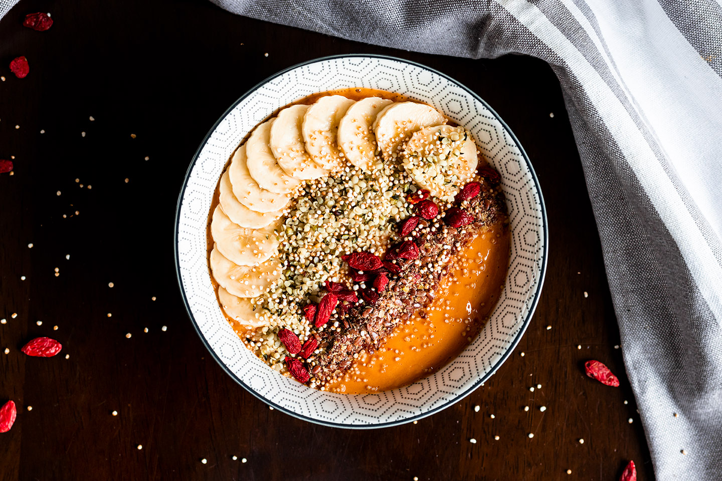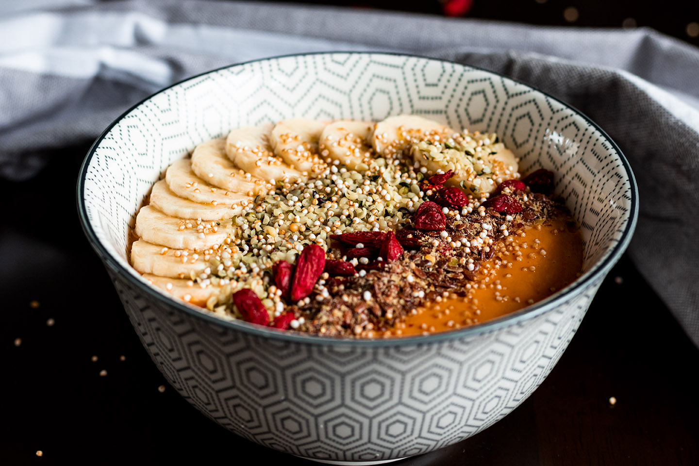 Damit die Möhre auch wirklich nicht auffällt, solltet ihr die Smoothie Bowl wirklich gründlich mixen, damit die Möhre nicht mehr stückig ist. Die Toppings könnt ihr natürlich auch je nach Geschmack variieren. Ich verwende in so ziemlich jedem Frühstück geschrotete Leinsamen, damit mein Körper täglich mit genügend Omega 3 versorgt ist.