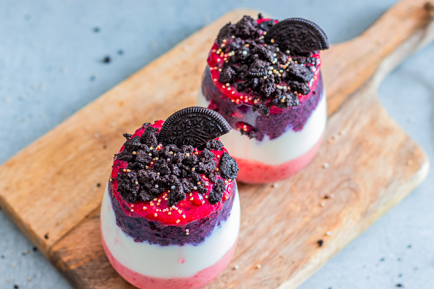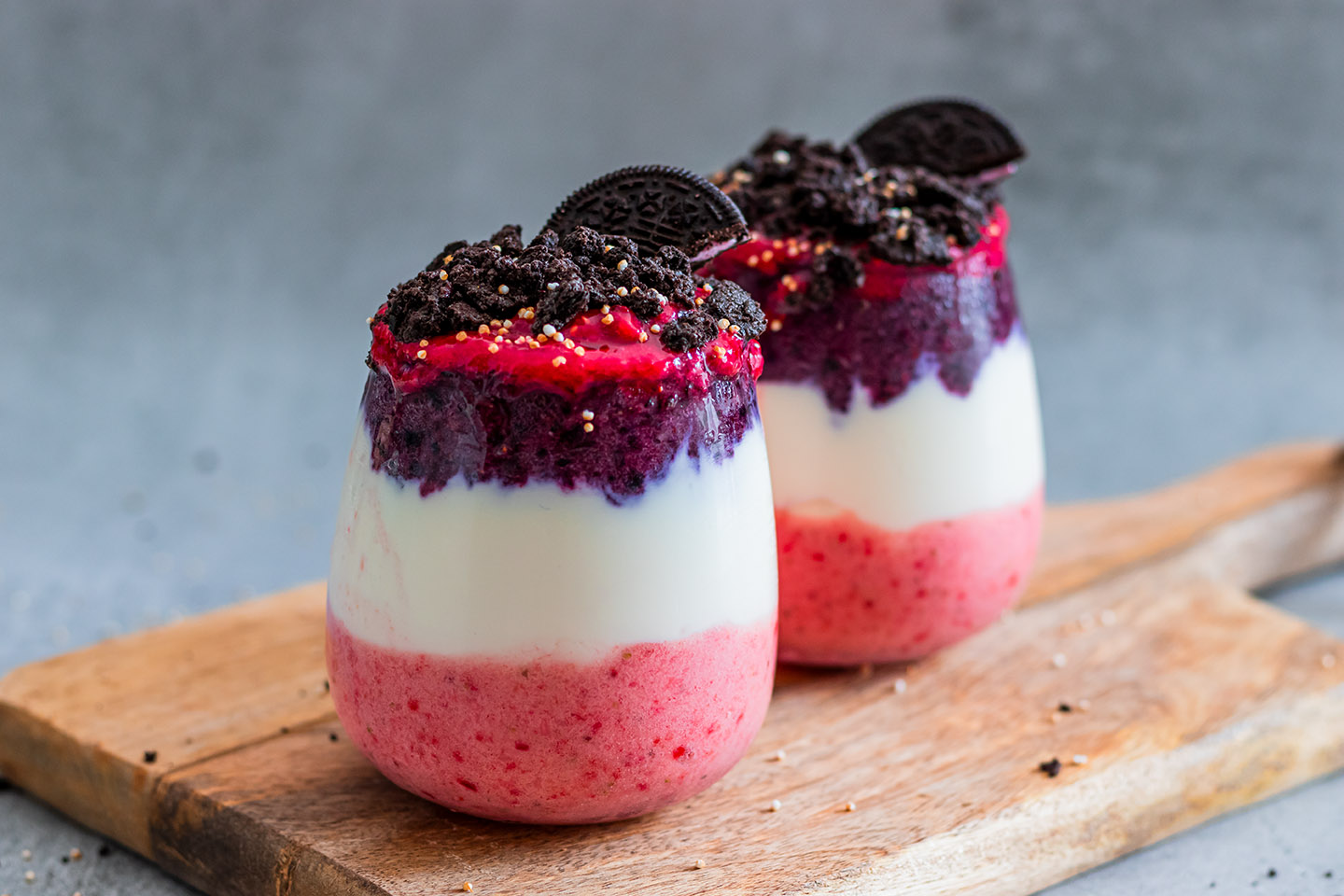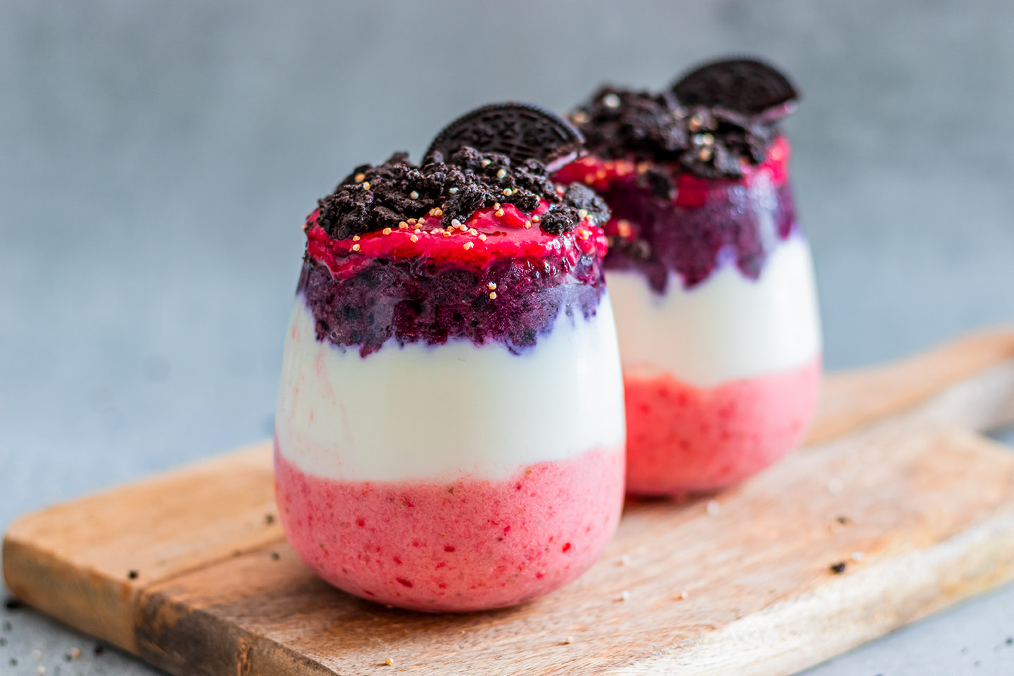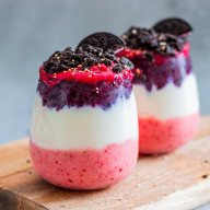 Die Schichten sind auch total variabel. Ich empfehle euch, euch von hell zu dunkel vorzuarbeiten, damit ihr den Mixer nicht viel auswaschen müsst (das ist für die faulen unter uns eine wirklich wichtige Information, glaubt mir). Die erste Schicht des Desserts besteht nämlich aus Erdbeer-Bananen-Eis. Die zweite ist reiner Joghurt. Die dritte kann entweder Banane-Heidelbeer-Eis oder Banane-Himbeer-Eis sein (die Himbeer-Variante zuerst macht mehr sinn, weil Heidelbeeren dunkler sind). Getoppt mit etwas veganem Keks oder gepufftem Getreide ist euer Dessert schon fertig. Zack, sind 10 Minuten rum und ihr habt einen richtigen Gaumenschmaus.