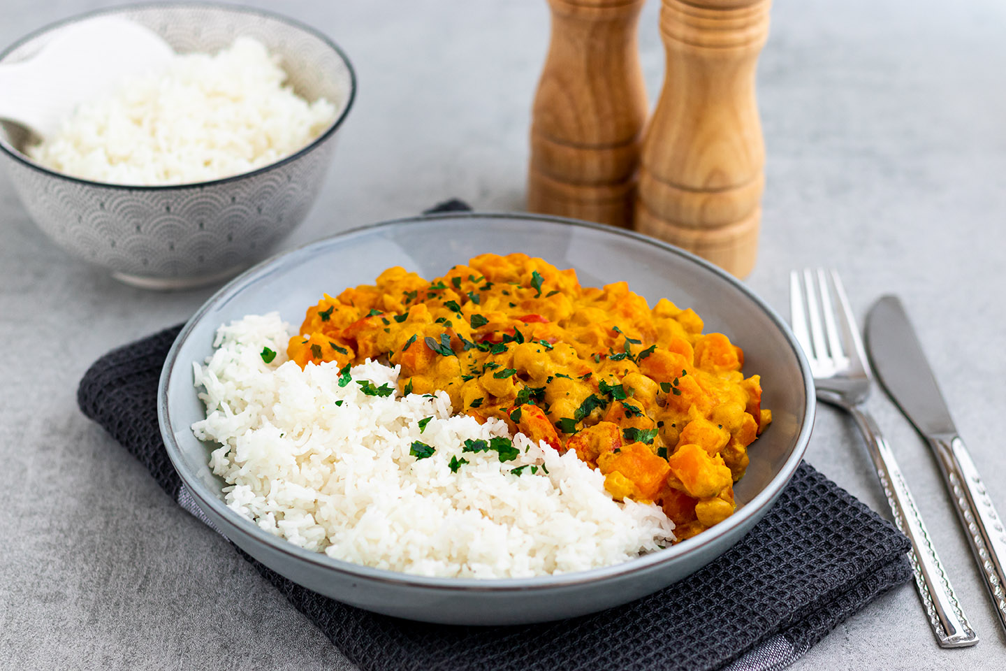 Außerdem steckt dieses Rezept voller guter Zutaten, die euch nicht nur lange satt halten, sondern auch extrem gut schmecken. Die Kichererbsen versorgen euren Körper mit viel Eiweiß, die Kokosmilch mit gesunden Fetten und die Süßkartoffel und der Reis mit komplexen Kohlenhydraten. Wer das Rezept allerdings fettreduzierter halten möchte, kann weniger Kokosmilch verwenden und stattdessen mehr Wasser verwenden.