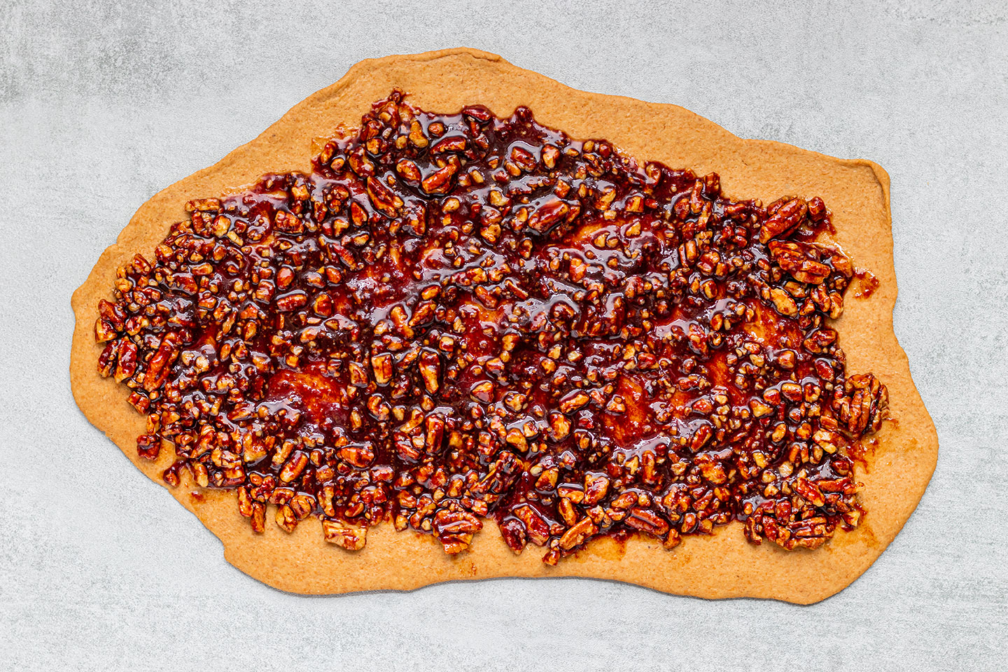 - Zuerst solltet ihr den Teig versuchen in ein Viereck auszurollen, um ihn dann mit eurer fertig vorbereiteten Füllung zu bestreichen. Wie ihr seht, hat das Ausrollen in ein Viereck bei mir nicht wahnsinnig gut geklappt, aber das ist am Ende auch gar kein Problem. Wichtig ist lediglich, dass ihr eine lange Seite habt. Der Teig sollte hier etwa 0,25 cm hoch sein, also schon relativ dünn.