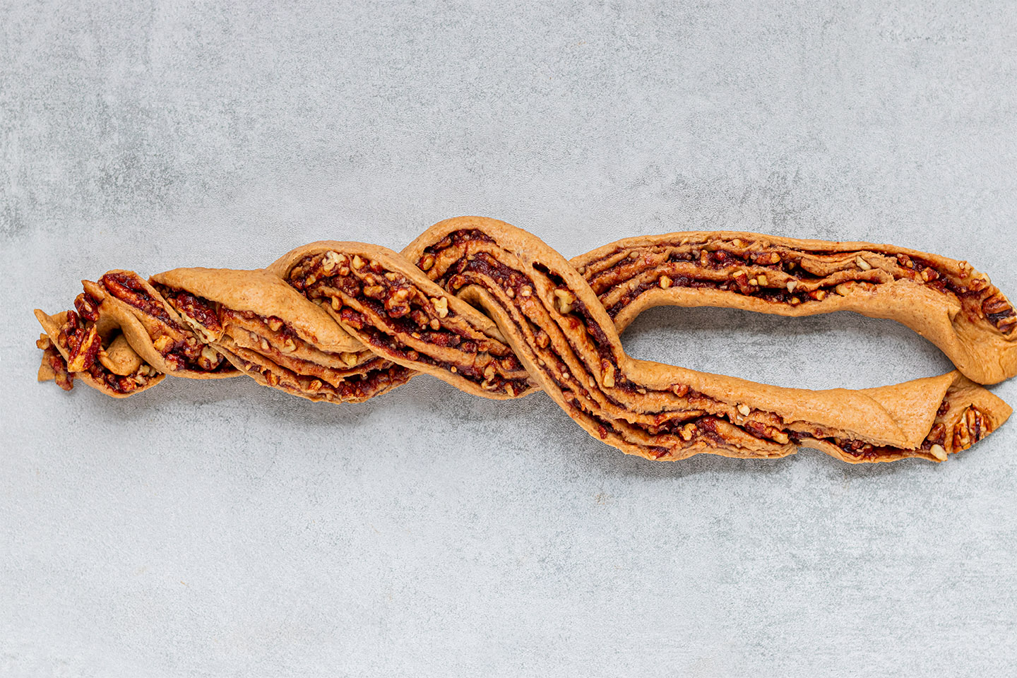 - Im nächsten Schritt rollt ihr den Teig an der langen Seite zusammen und schneidet ihn längs durch. Anschließend formt ihr einen Zopf aus beiden Hälften und drückt beide Enden etwas aneinander.