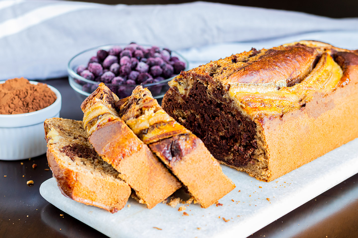 And because I love chocolate, but I didn't want too much chocolate in this banana bread, I decided to make a variation similar to marble cake by mixing one half of the dough with cocoa and then using a fork to mix it spirally with the light-coloured dough. So you have a super nice marbling (is that how you say it?) and the dough is a perfect mixture between vanilla and chocolate. Ok, I have to stop raving, otherwise I slowly get hungry again.