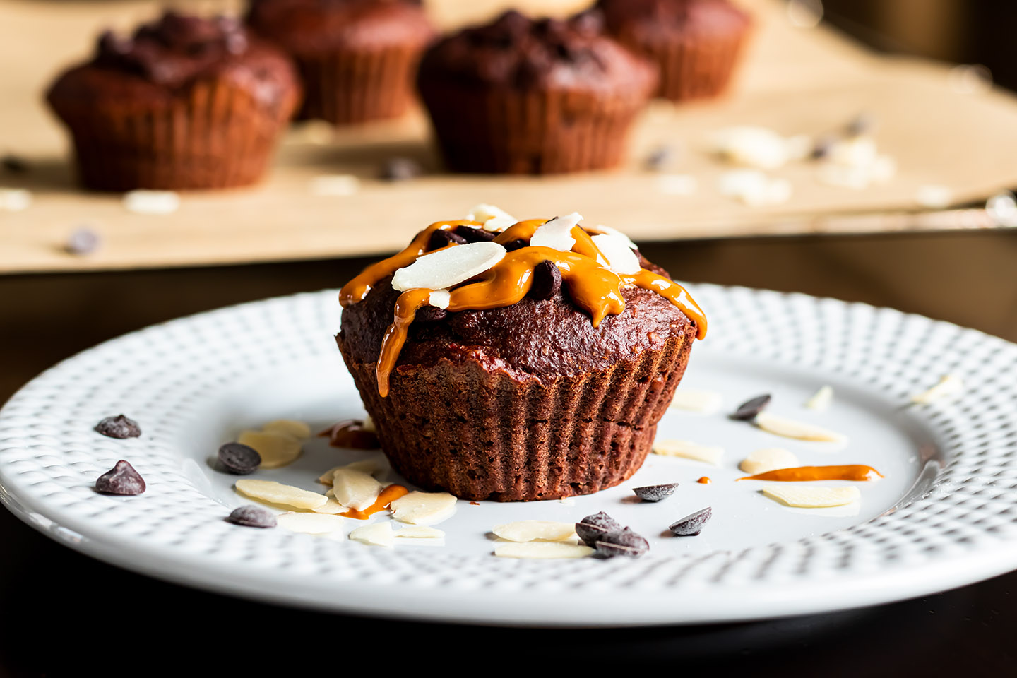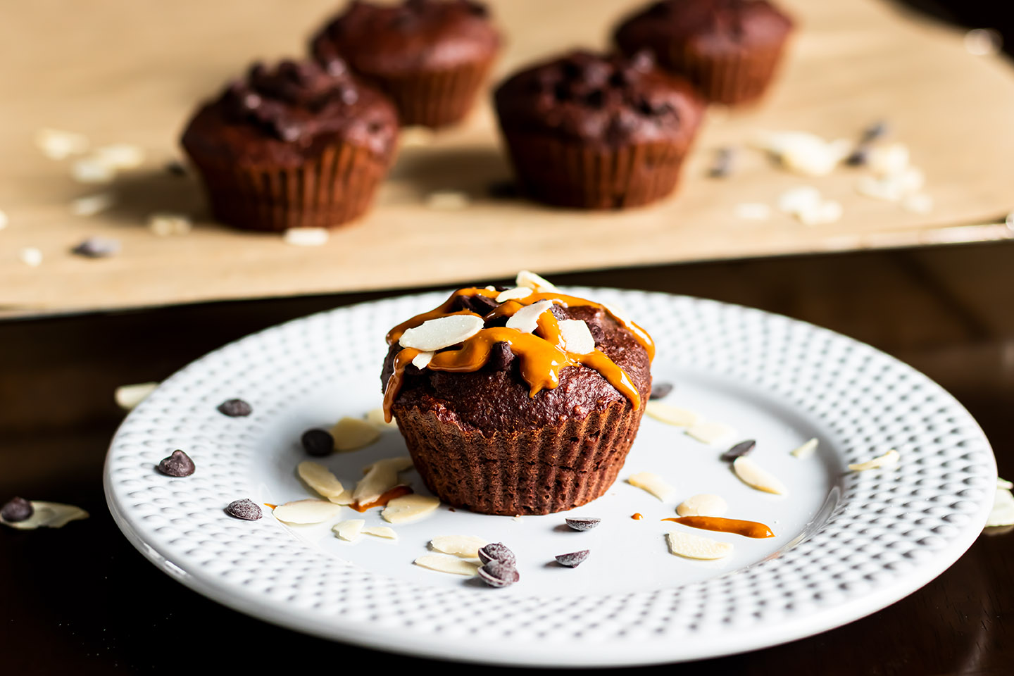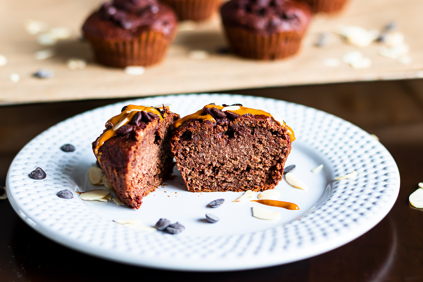 Topped with some peanut butter (I prefer to use the peanut butter from Manilife*) these Mini Mufifns taste like a "sin", but they are no sin at all, because only healthy ingredients are used. The chocolate and almonds give it the perfect chocolaty and nutty touch.
