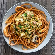 One of my favourite recipes that I always eat when I need to eat quickly is this mushroom tofu pasta pan. It does not need many ingredients and can be prepared in no time at all. Moreover, according to our kitchen, it is made from basic ingredients. In my opinion, it is always good to have tofu, soy or oat cream and wholemeal pasta at home in a vegan diet. When I do my weekly shopping I always like to take a package of mushrooms with me, because I eat them so often. So it's perfect if you have these ingredients directly at home. And even if you don't - they are always bought quickly!