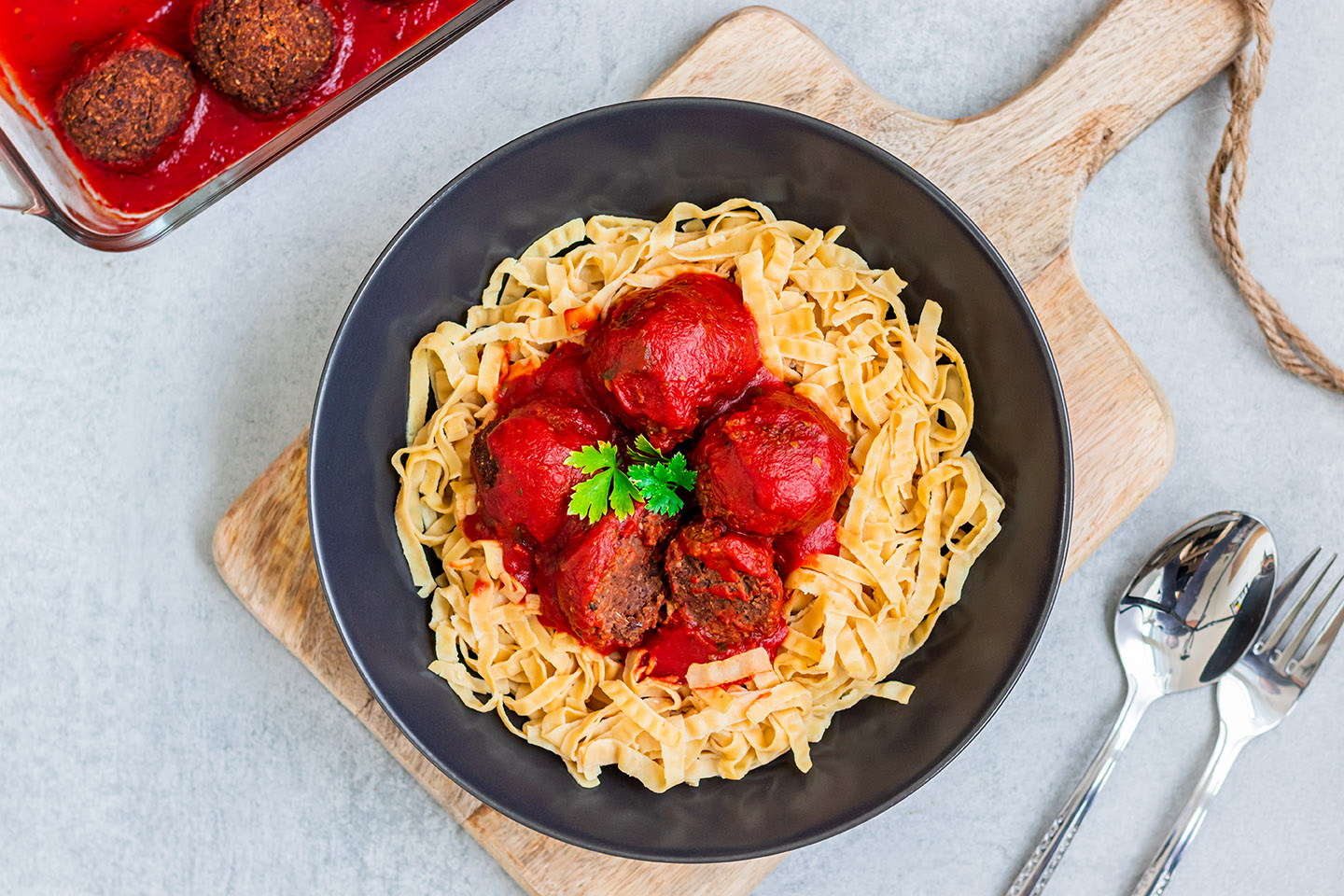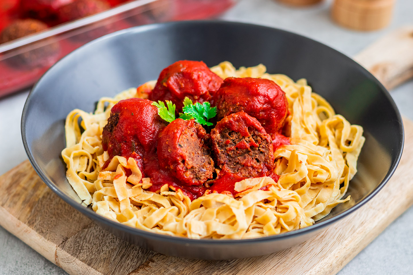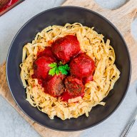 By the way, this dish is also very suitable for children, as we have noodles with tomato sauce. The absolute classic. In addition there are only a few pimped out protein balls, if you like.