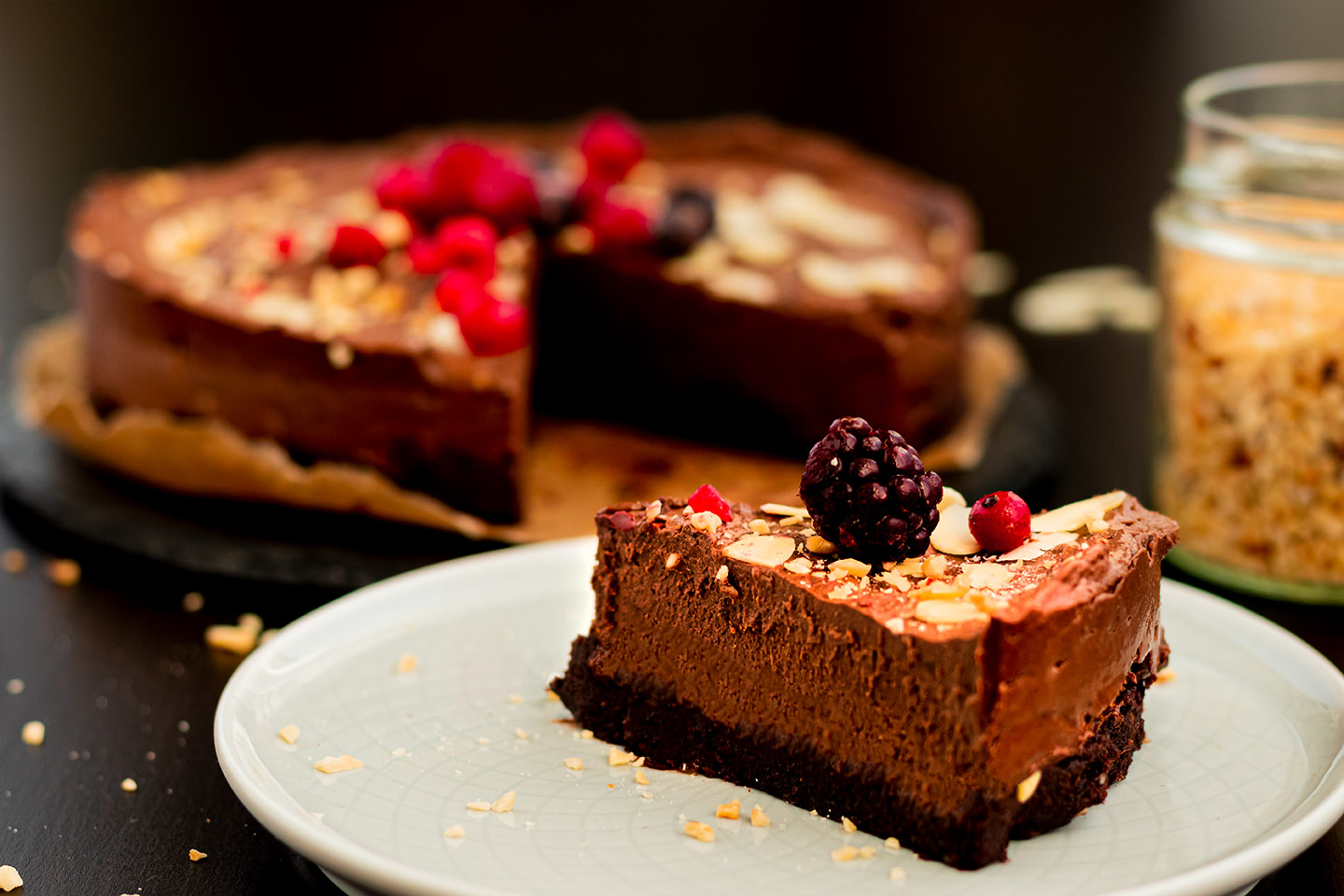 This chocolate cake is not baked, but you simply mix 2 different masses, which together create a taste orgasm. Sorry for the vulgar description, but real chocolate fans like me will understand what I mean. In fact you don't need any fancy ingredients either. The base is a date and nut mixture and the filling mainly consists of (yeah okay, you can argue about fancy now) avocado, banana and cocoa. If you don't like banana in chocolate cake, you can do without it and use only avocado instead. I know, avocado in cake sounds unusual at first. But trust me, in the end you won't taste the avocado out at all, but simply have a very creamy and delicious filling - I promise!